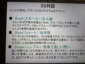 対話の場づくりの基本を学び、オカンが開発した3S対話を現場でするとしたらどんなテーマ・ゴール・対象で実践するか一緒に考えます。