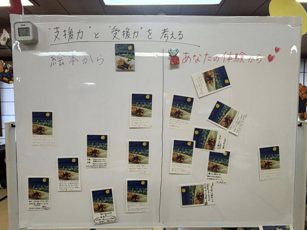 絵本から支援力と受援力を考えてカードに書いて白板に貼りました。